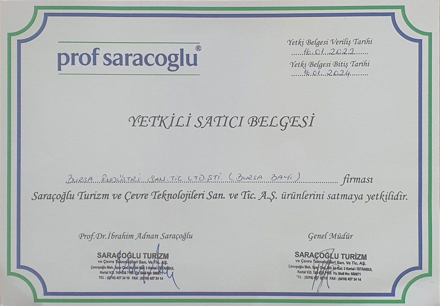 Yetkili Satıcı Belgemiz2011 yılından beri, Prof Saracoglu ürünlerinin Güney Marmara Bölge Bayiiliğini yürütüyoruz.